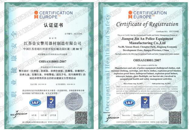 第一批新型單警裝備定點生產企業 公安部警用裝備采購中心協議供貨單位 公安部防彈防刺服生產定點企業 江蘇省公安廳防彈衣入圍企業 江蘇警用裝備行業協會會員單位 中國刑事科學技術協會團隊會員單位 中國安全防范產品行業協會會員單位 靖江市保安器材行業協會常務理事單位 全國警用裝備標準化技術委員會通訊委員 江蘇金安警用器材制造有限公司始創于九十年代初,公安部防彈防刺服生產定點企業、公安部警用裝備采購中心2..